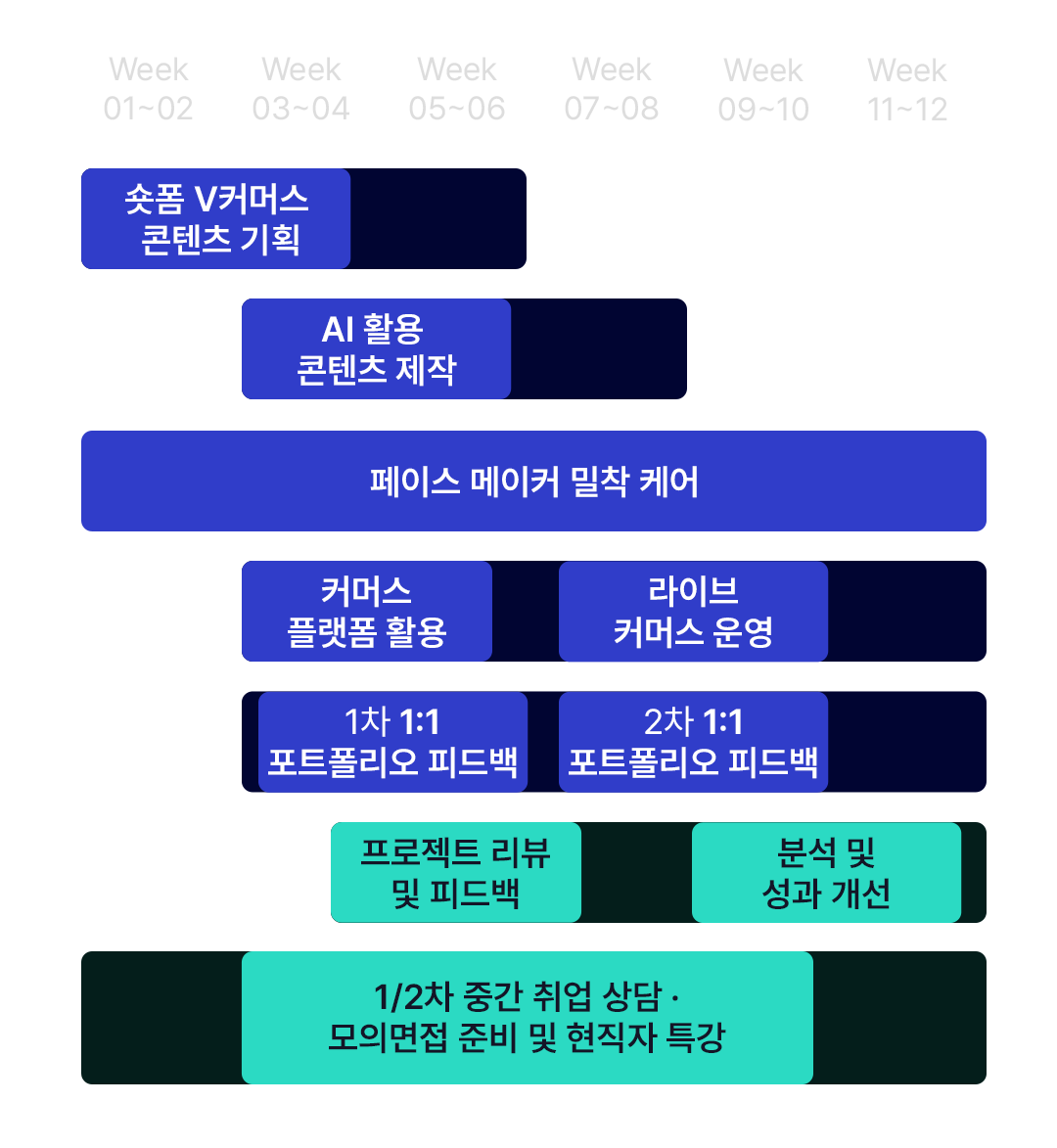 week 04~08 / week 09~11 : 프로젝트 리뷰 및 피드백 / 분석 및 성과 개선